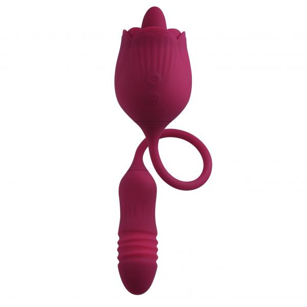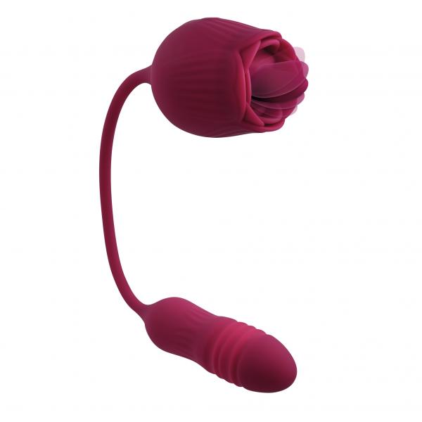Two unique sensations connect with a flexible cord in this extraordinary toy that delivers delicious pleasure in two exquisite ways! A textured, vibrating, thrusting bullet on one end ramps up to 10 speeds for a surprising spontaneous feel, while the velvet smooth rose at the other end surrounds a 10-speed vibrating, flicking tongue that targets with intensity. Experience one feature at a time or both simultaneously with independently controlled motors. Water submersible, easy to clean, USB magnetic rechargeable. Thrusting bullet with tongue-flicking rosePowerful 10-speed vibrating, thrusting bullet10-speed vibrating, flicking tongue inside roseConnected by flexible silicone cord2 motors controlled separately Rose andamp; bullet textured for stimulationEasy to use 2-button control panelLED lights illuminate buttons when in useMade from creamy smooth siliconeHeight: 13.61, Depth: 2.19, Width: 2.19Insertable bullet length 3.75, Insertable diameter 1.15.25 thrusting distanceWeight: Under .5 lb Phthalate andamp; latex freeWaterproof andamp; submersibleMagnetic rechargeable, USB cable included