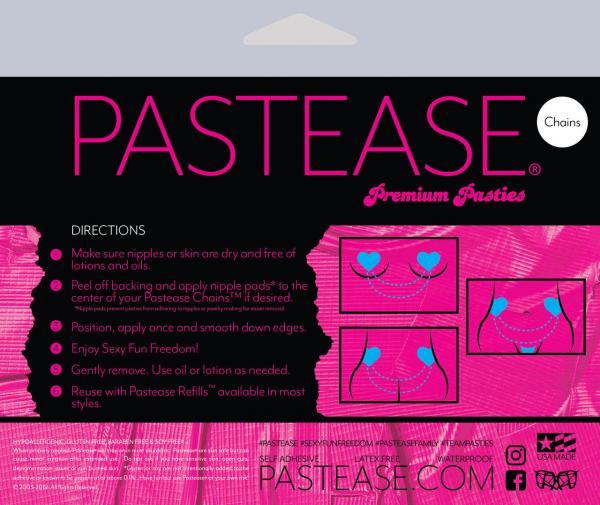 Gold Shattered Disco Ball Heart with Gold Chains Pasties from Pastease Brand. All Pastease are hand-made in the USA of soft form fitting material that forms seamlessly to curves and resists wrinkling over hardening nipples. Just peel and stick on clean, dry skin. All Pastease feature latex free, medical grade, waterproof adhesive that stay securely in place for as long as you like and until they are gently removed.Conceal or reveal with Pastease nipple pasties when worn with a sexy outfit, daring bikini, sheer top, revealing dress, Hefty bag, body lotion, crazy costume, party theme or nothing at all! Dimensions 3 inches by 2.5 inches. Coverage diameter 1.8 inches. Pastease are the fun maker that brings out your inner Tease!