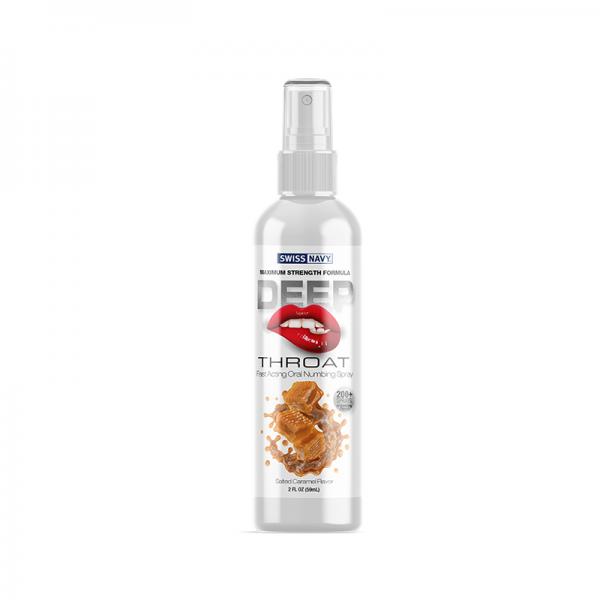Swiss Navy Deep Throat Spray Salted Caramel 2 fluid ounces from MD Science Labs. Swiss Navy Deep Throat Fast Acting Oral Numbing Spray is a delicious desensitizer that helps make oral sex more enjoyable and comfortable. Deep Throats proprietary formula quickly and effectively numbs the deep throat area and suppresses gag reflexes. The salted caramel flavor combines sweet and salty for an irresistible taste experience. Proprietary formula quickly and effectively numbs the deep throat area and suppresses gag reflexes. Safe for use orally. Intended to enhance the ease and comfort of oral sexual activities with a great taste. Active ingredient Benzocaine 5%. Inactive ingredients: Glycerin, PEG-400, Water, Flavor, Sodium Benzoate, Potassium Sorbate, Acesalfame Potassium. Categories: Sprays, Desensitizing Spray, Oral Products, Health and Beauty Aids. Adults only please. Do not use for teething on children. 2022.